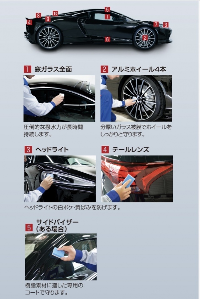 ◉新しいタイプのガラスコーティング。1年間、ノーメンテナンス、ガラスの艶と透明感。当店で1番人気のコーティングです。「施工はSサイズ2時間程度からで施工頂けます。必要な場合は代車も無料貸出致しております。」