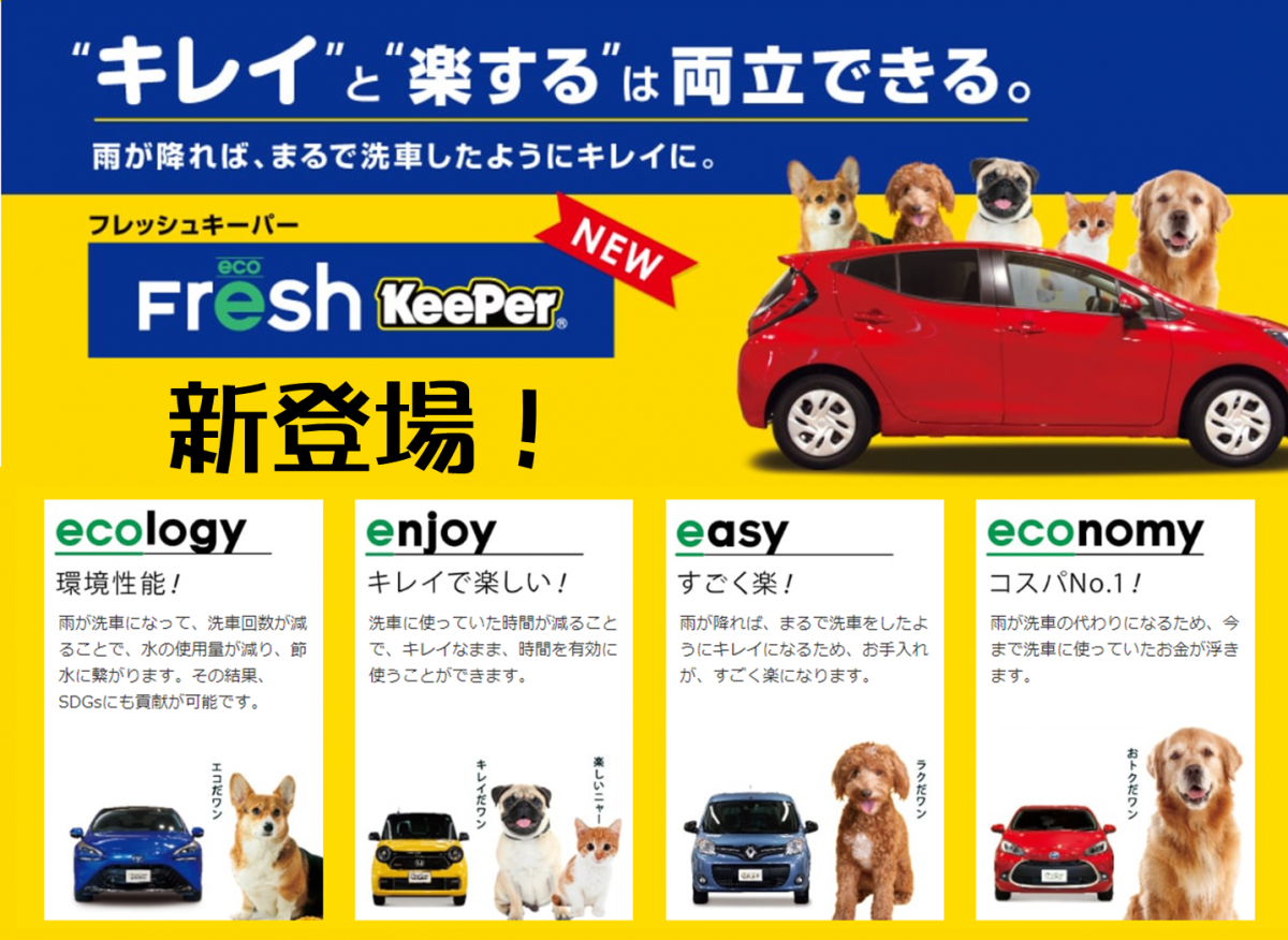 フレッシュキーパーは、汚れの密着を防ぐ独特な防汚能力を持ち、ホコリが降り積もっても塗装表面には密着せず、自然の雨が降れば元々持っている撥水力で、雨と一緒に汚れが流れ落ち、まるで洗車をしたようにキレイになります。