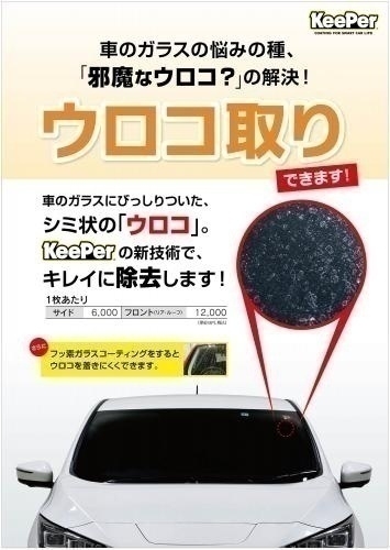 ウロコ取りの料金はフロント・リアガラス、サンルーフは一枚当たり12,000円。サイドの窓ガラスは一枚当たり6,000円です。