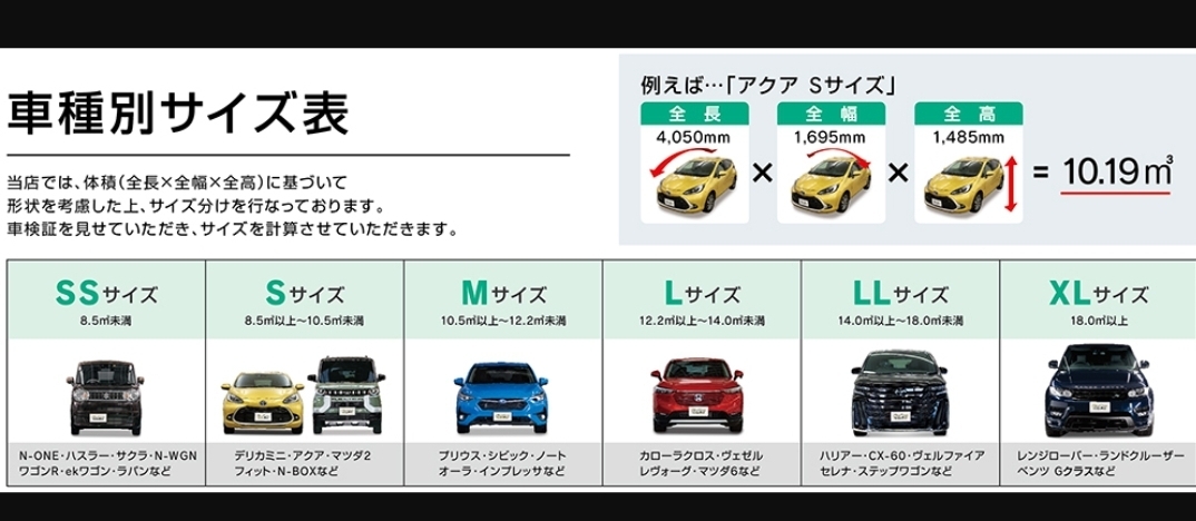 上記サイズ別価格設定は、「全長」×「全幅」×「全高」から体積を算出しております。