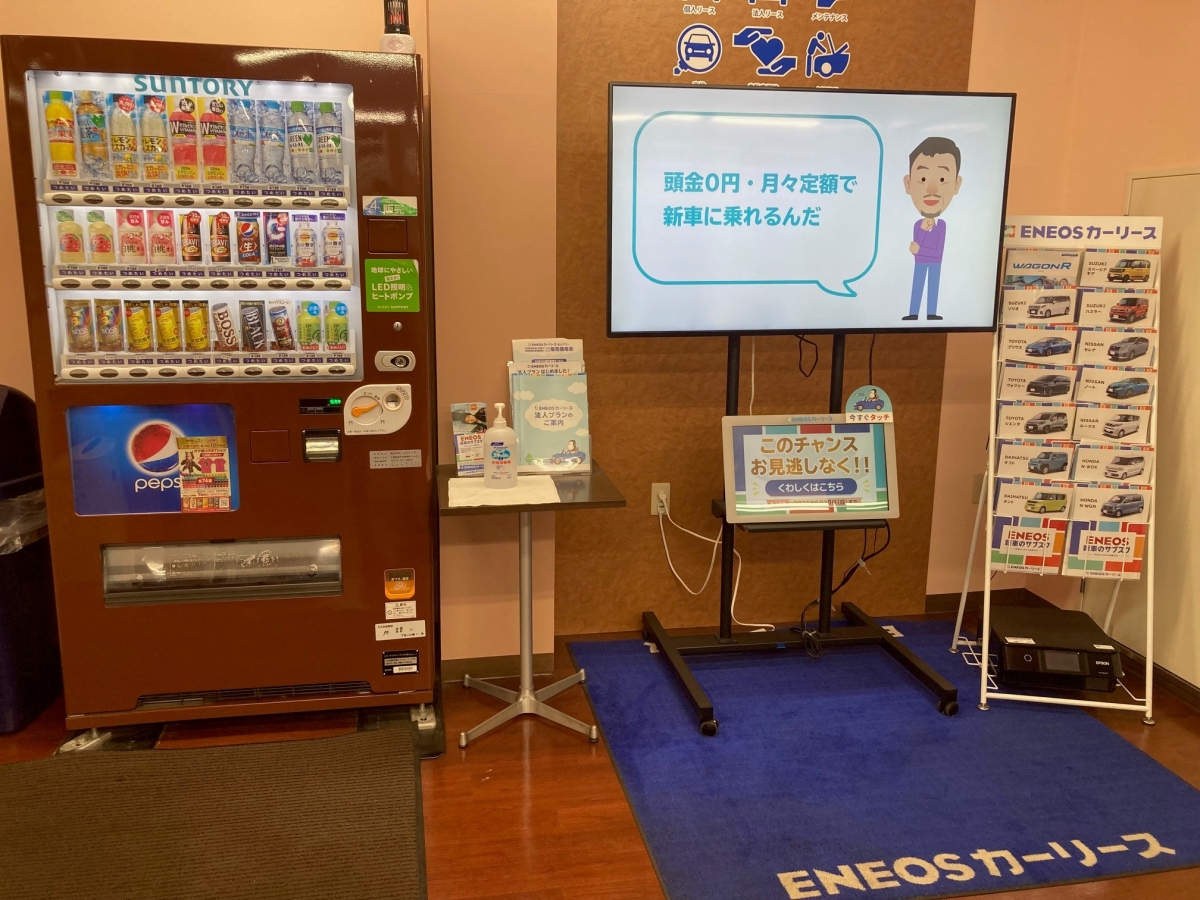 お待ち時間には雑誌エリア、自動販売機・ENEOSカーリースブースがございます。