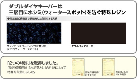 だから、多くのボディガラスコーティングのように無機質の表面に、水道水などに含まれる無機質のミネラル(カルシウム、マグネシウム、ケイ酸塩)が”固着”して出来る醜い「水シミ」を、Wダイヤモンドキーパーは表面を有機質にする事によって本質的に防止する事が出来ます。また、ガラス被膜とは違う屈折率を持つ透明なレジン被膜は、ガラス被膜単体とは異質のより強いツヤと、強撥水性を出します。