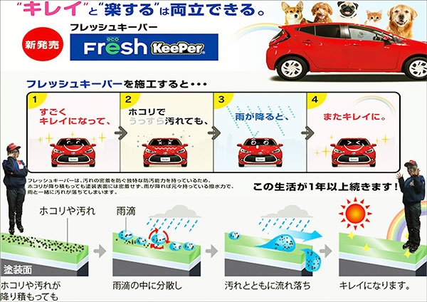 「車を奇麗にしたいけど自分では…」 「洗車は好きなんだけど、すぐ汚れちゃうから嫌になっちゃう…」 「雨の日に車を使う事が多いんだけど、ボディの水はじきがイマイチ…」 「ウチの車、太陽がよく当たる駐車場でボディの状態が心配…」 そ!ん!な! お悩みを身近に解決してくれるのがコーティングです。 施工するだけで、お手入れはシャンプー洗車だけ、いつも美しい状態を保てます。