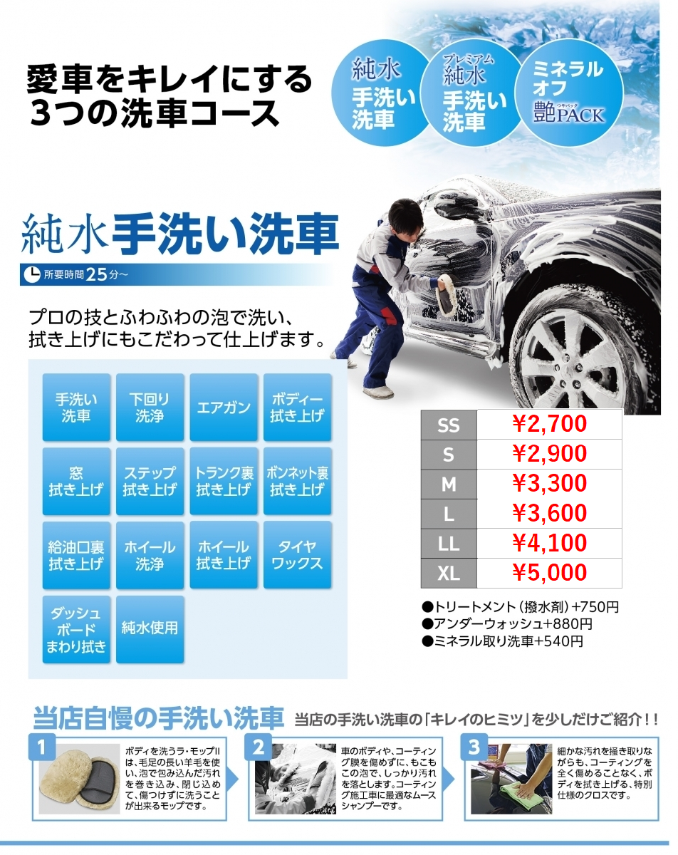 A:当日のご注文でOKです。また、事前にお電話でご予約頂くことでお待ち頂くことなくご案内しております。 もちろん手洗い洗車のご予約も承ります!