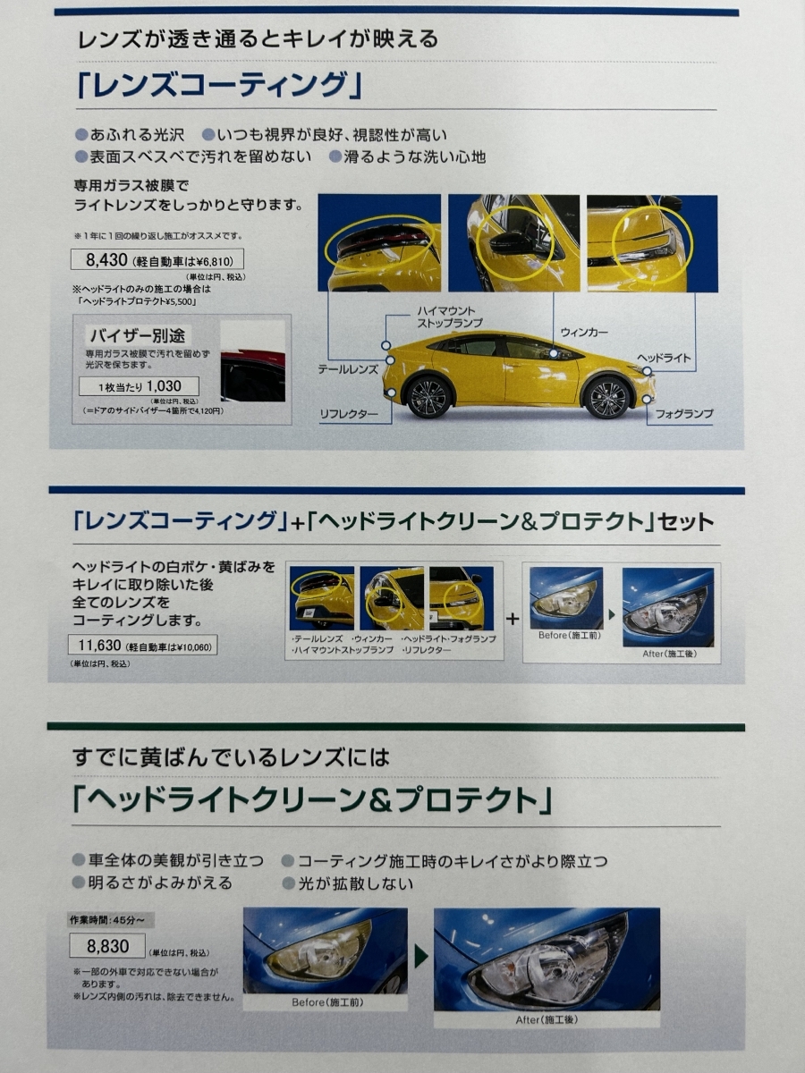 新車施工には「レンズコーティング」、経年劣化車には「ヘッドライトクリーン&プロテクト」が人気です!!
