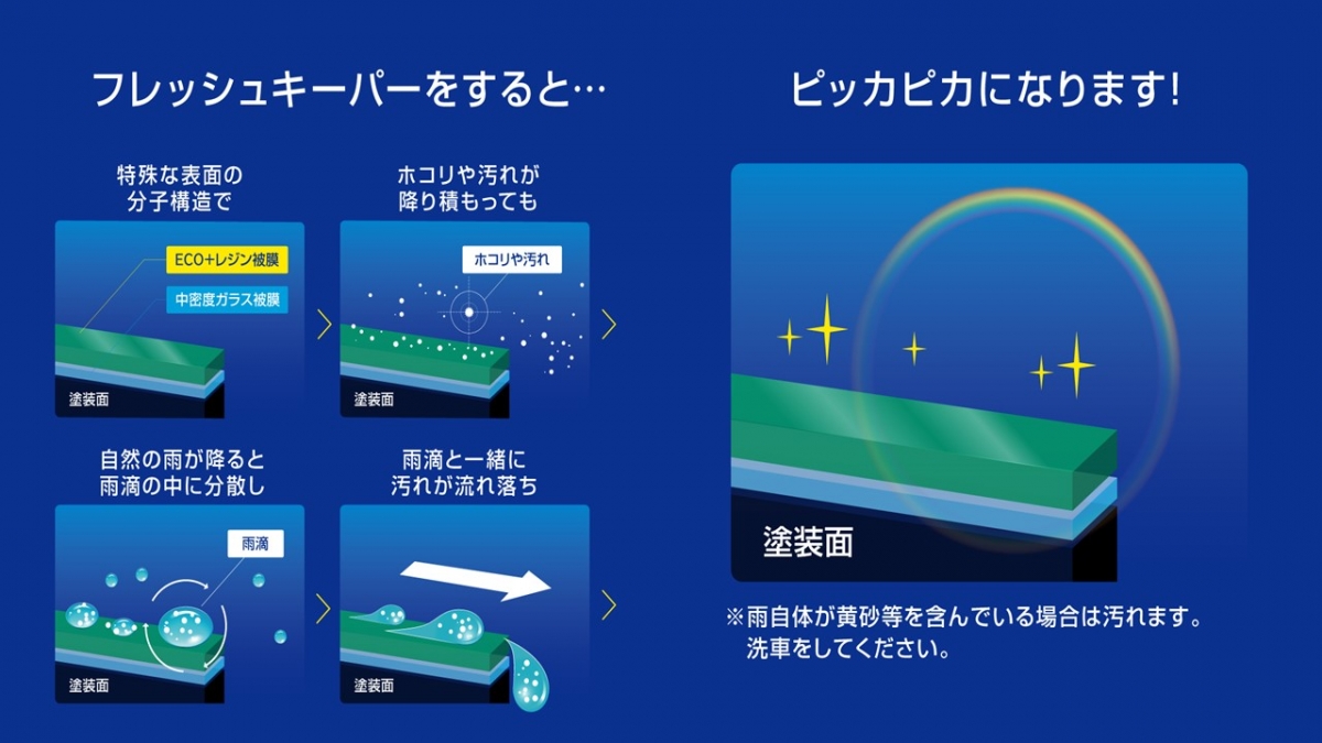 ●塗装面にポリマー被膜を形成し、3カ月間の汚れや紫外線などからボディーをお守りします。