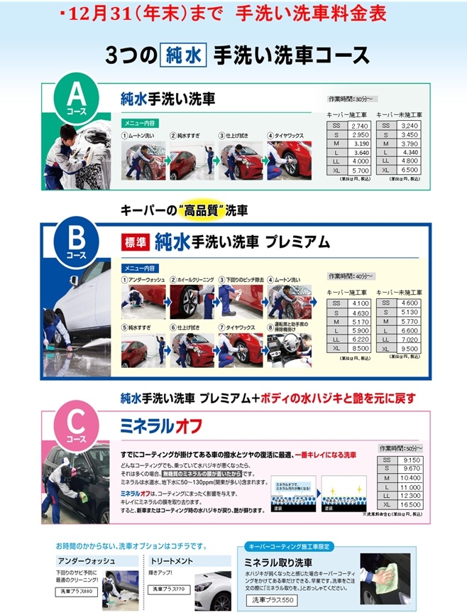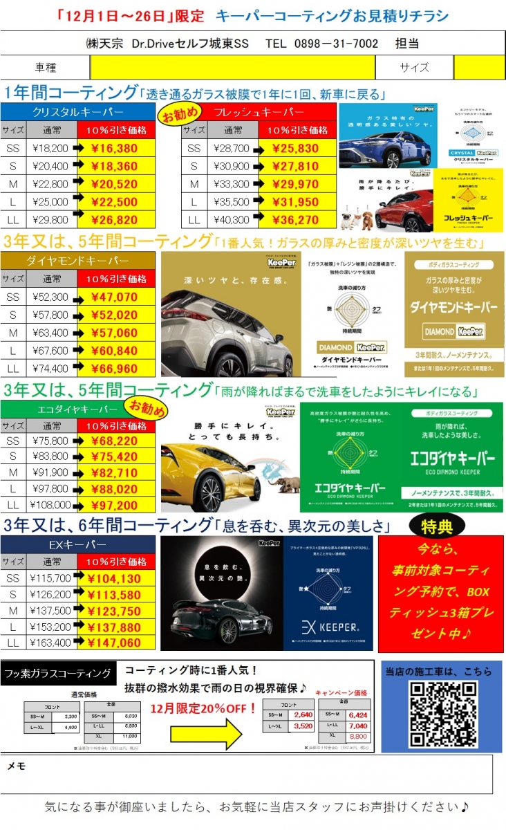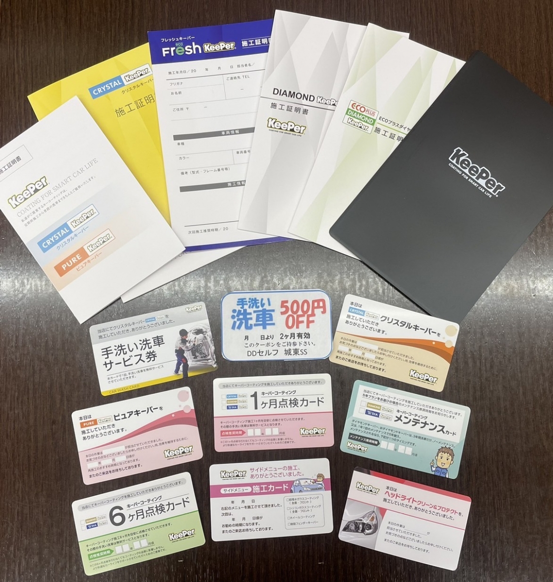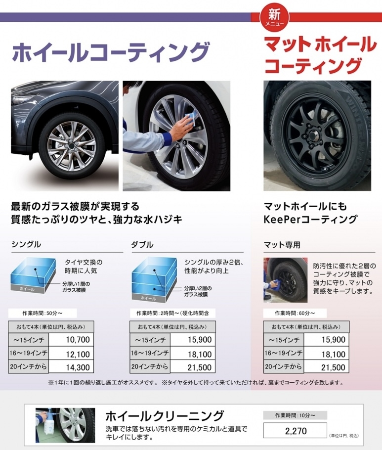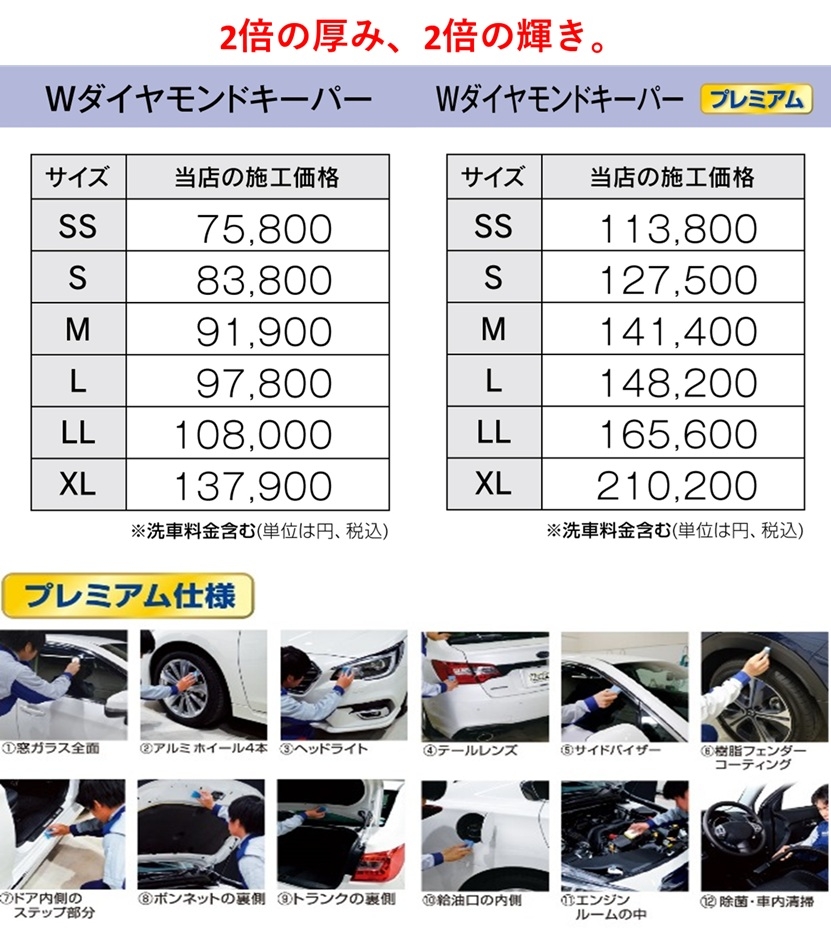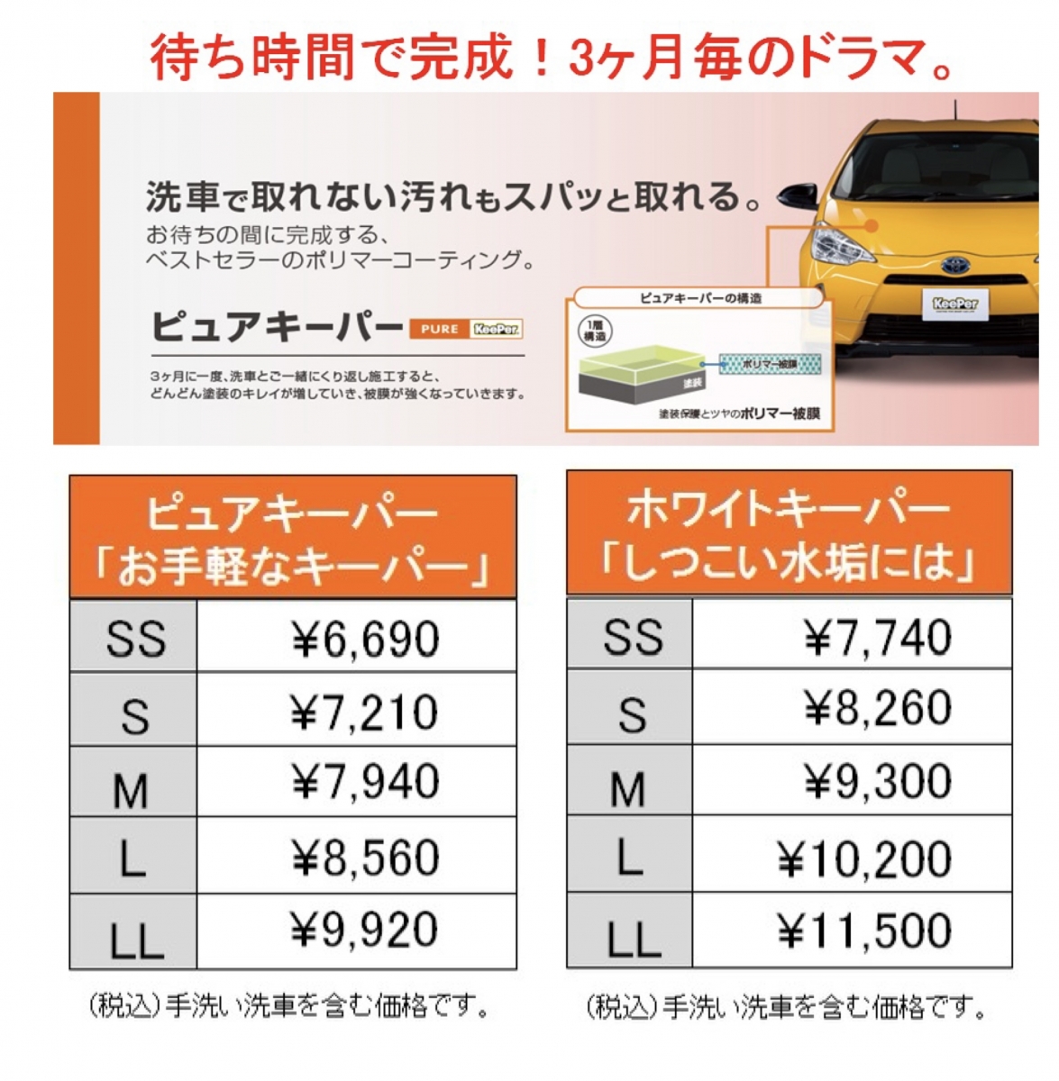 更に、新車割適用で対象コーティング全品5%OFF(EXキーパー、エコダイヤキーパー、Wダイヤキーパー、ダイヤⅡキーパー、ダイヤモンドキーパーに限る)(新車登録から6か月以内で適用)です。