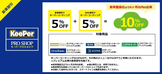 新車登録から6か月以内なら新車割引があります!※ダイヤモンドキーパー、ダイヤⅡキーパー、Wダイヤモンドキーパー、エコダイヤキーパー、EXキーパーに限る。