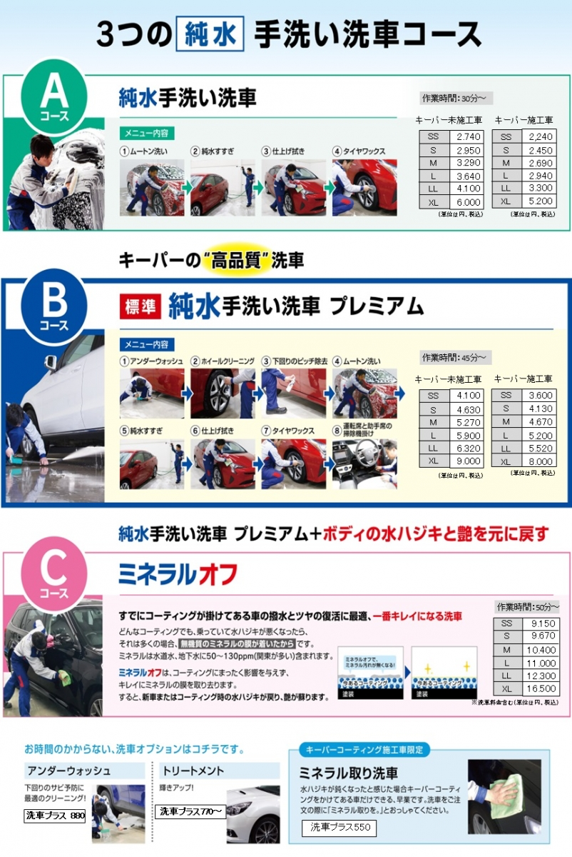 新車コーティングはもちろん中古車、国産、輸入車どんな車もキレイに致します。施工後もずっとキレイに乗れるようにお手伝い致します。他ではなかなか体感出来ない「純水手洗い洗車」も大人気です!