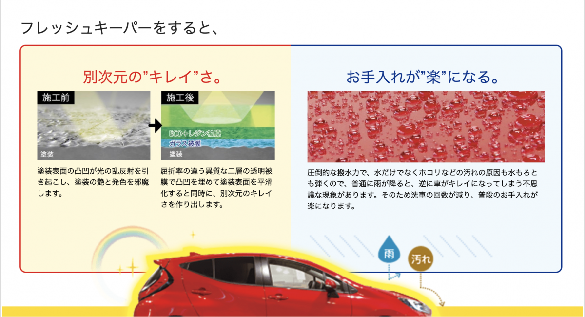 すると、新車またはコーティング時の水ハジキが戻り、艶が蘇ります。