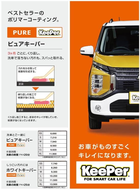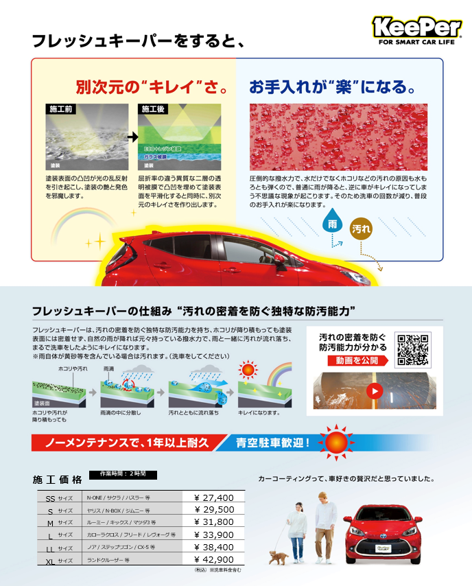 キーパーで一番人気!! キーパー独自の2層構造によるコーティング被膜がお車を守ります。 1年間洗車だけで、ノーメンテナンスが1番の魅力です。 施工時間:2時間程度(洗車時間を含む)お車をお預かり致します。 ※お車の状態によっては別途、軽研磨、鉄粉・ピッチ除去等下処理料金がかかる場合ございます。