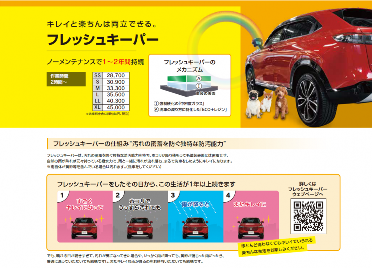 コーティングの艶は「ダイヤモンドキーパー」クラスでありながら、雨が降れば洗車をしたようにキレイになる効果を備えた新感覚の商品です。