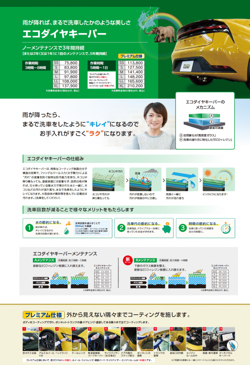 ECOプラスダイヤモンドキーパーは、ベストセラーの「ダイヤモンドキーパー」の表面に、従来のレジン2の代わりに新ケミカル「ECOプラスレジン」を施工し、『自然の雨が洗車になる。』効果を実現しました。