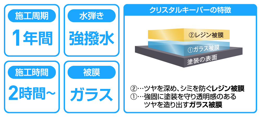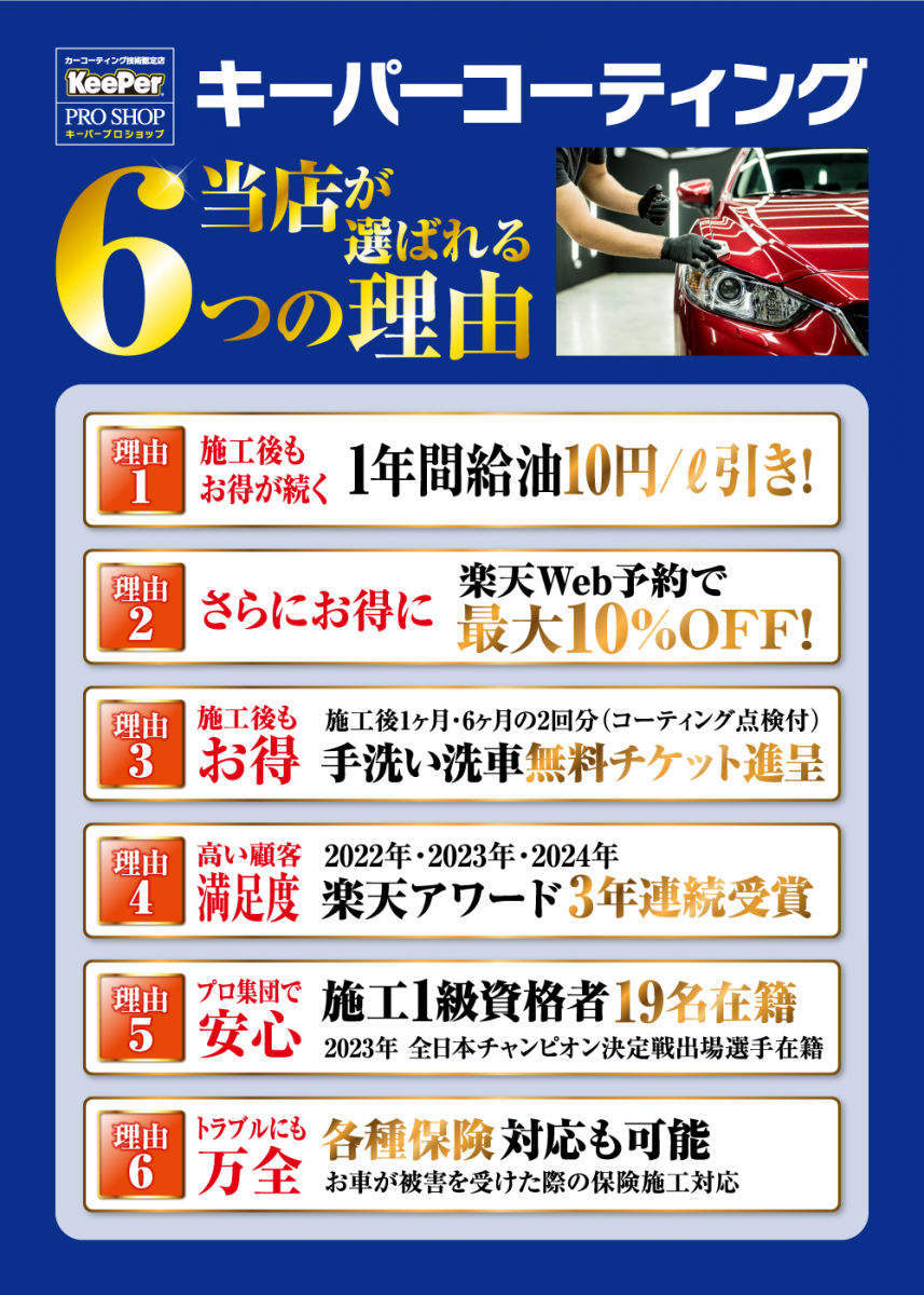 また、コーティング施工後に万が一事故に遭われて、保険を使用してお車を修理することになった際は、損害保険の対象になる場合がございます。