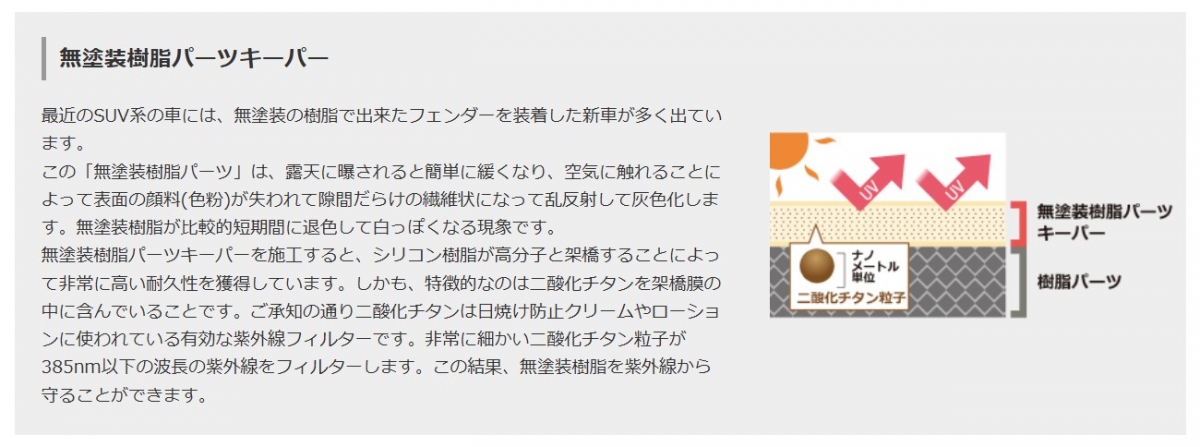 最近のSUV系の車には、無塗装の樹脂でできたフェンダーを装着した新車が多く出ています。この「無塗装樹脂フェンダー」は、露天に曝されると簡単に緩くなり、空気に触れることによって表面の顔料(色粉)が失われて灰色化します。樹脂フェンダーキーパーを施工することで表面がコーティングされ、無塗装樹脂を紫外線から守ることができます。