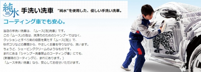 純水機導入により、当店の手洗い・コーティングはすべて純水を使って作業します。 純水とは、水道水に含まれる不純なミネラル分を除去した水です。 車の撥水・艶を阻害するミネラルが入っていないため、仕上がりに差が出ます。