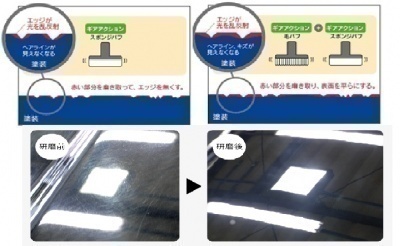 傷のエッジを削るとともに、塗装面全体が滑らかになるように磨くので塗装の厚みはほぼ変わりません。