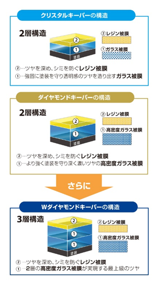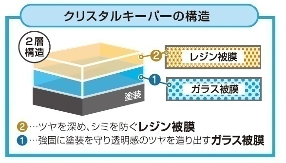 2層構造1層目が高密度なガラス被膜2層目レジン被膜、1層目が高密度ガラス被膜でより強く塗装を守り深く濃いツヤを出す、2層目のレジン被膜が身代わりとなり外部の汚れ(攻撃)を受け止める!!!