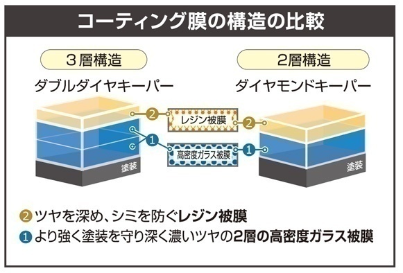 2層構造1層目がガラス被膜2層目がレジン被膜、2層目のレジン被膜が身代わりとなり外部の汚れ(攻撃)を受け止める!!
