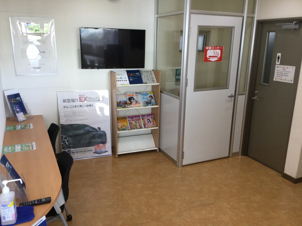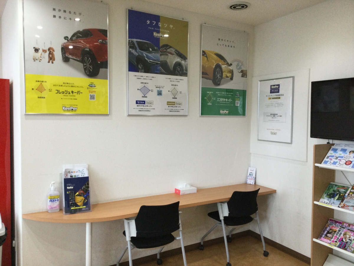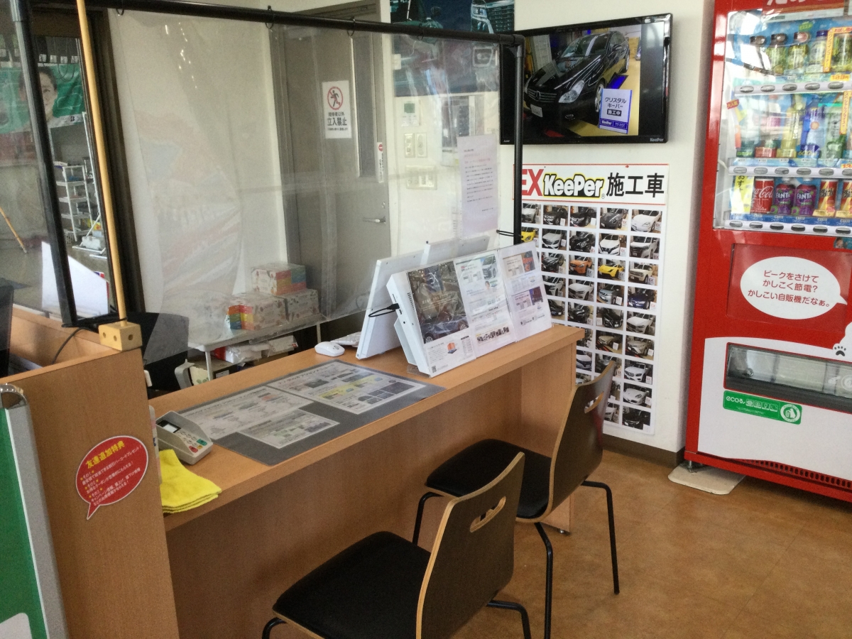 カウンター横ではコーティング施工車を写真やモニターにてご覧頂けます(^^♪