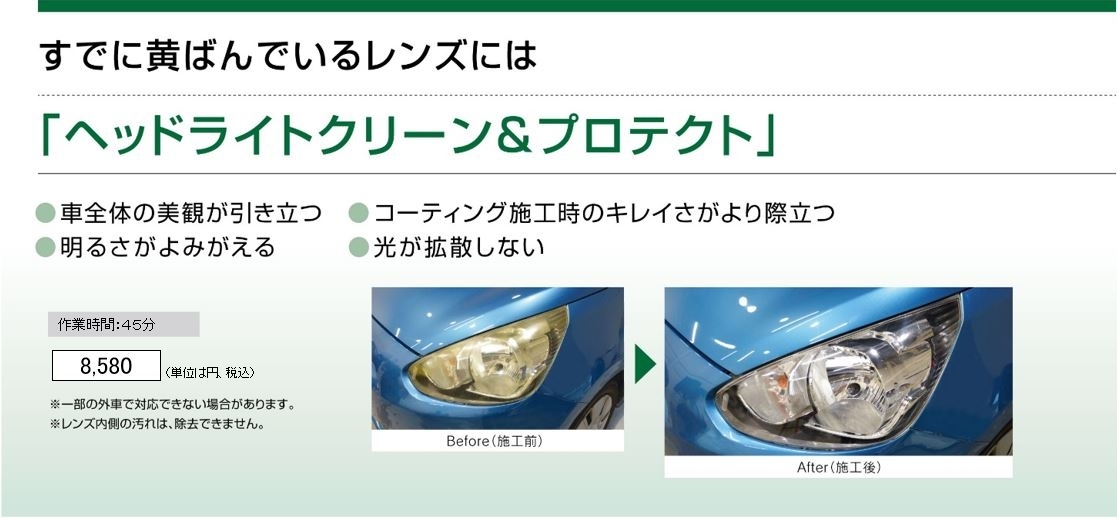 紫外線で劣化し黄ばんでしまったヘッドライトを復活させ、コーティングを施します。