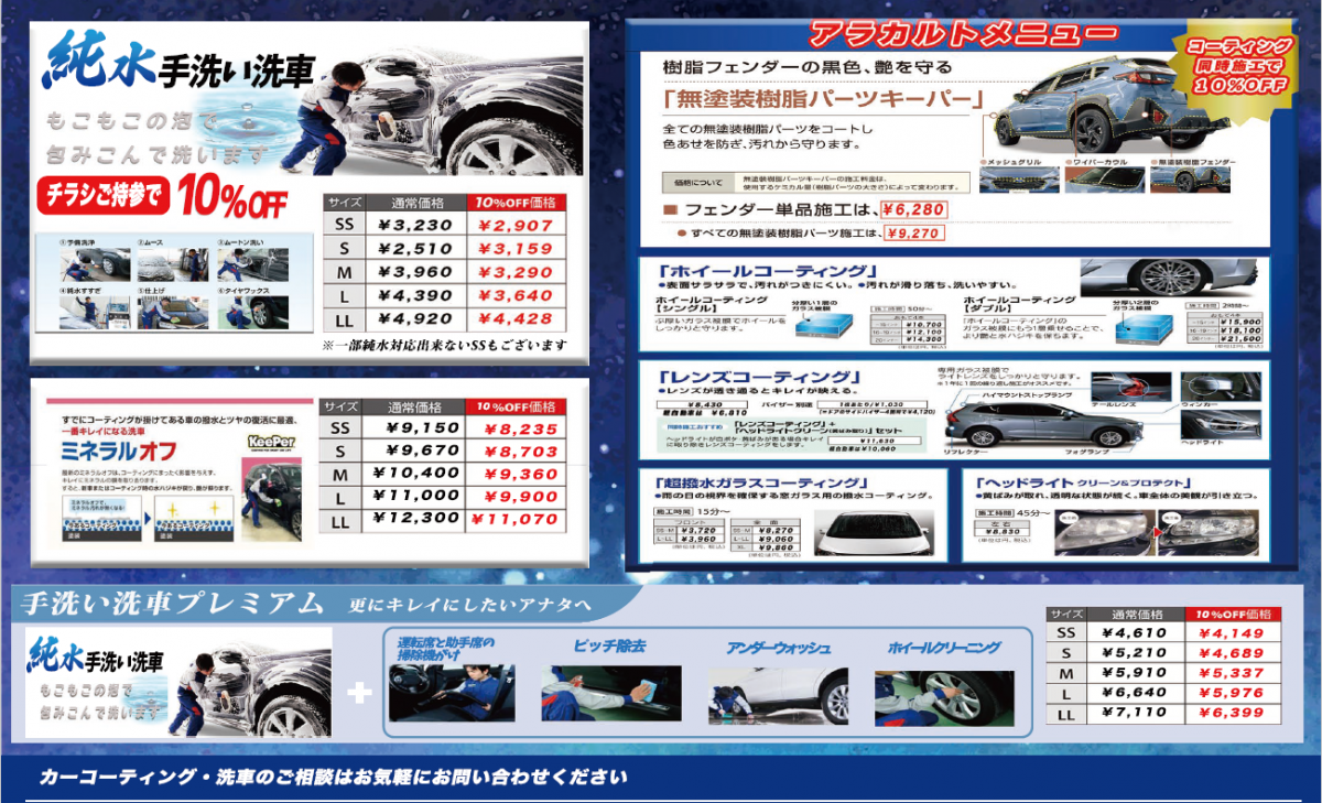 ※こちらのメニューはコーティングではございませんが、水ハジキも良くなり、お車もキレイにできるメニューとなります!!塗装が激しく劣化していない限り、お車を短時間でキレイにできるメニューとなります。(洗車+30分程度)