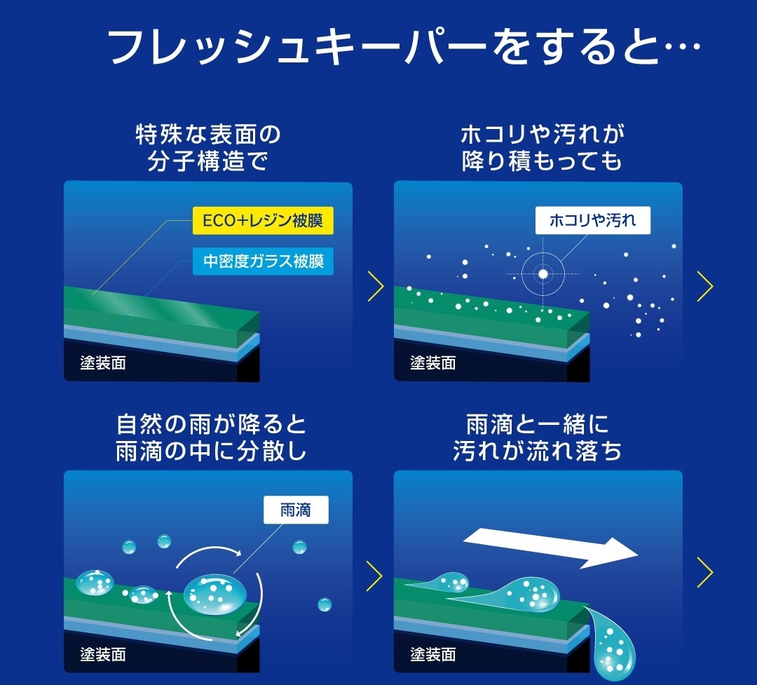 圧倒的な撥水力により雨の後でもまるで洗車をしたようにきれいになり、洗車の頻度も少なくすることができます。