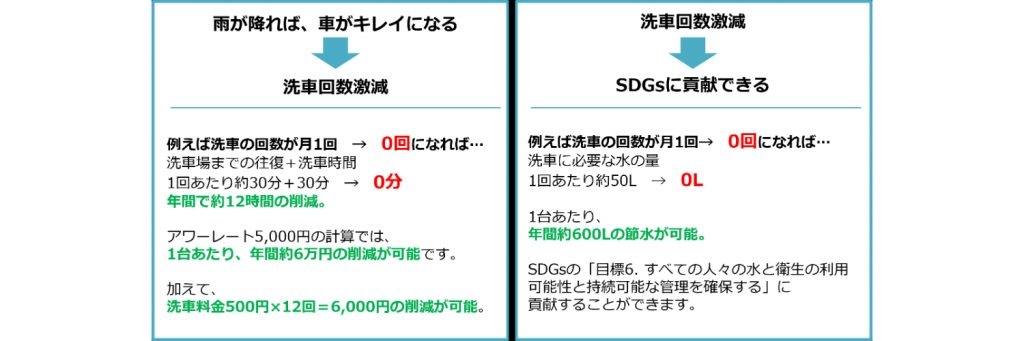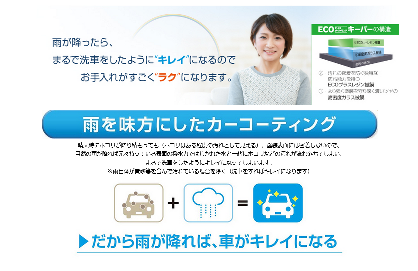 圧倒的な撥水力により雨の後でもまるで洗車をしたようにきれいになり、洗車の頻度も少なくすることができます。