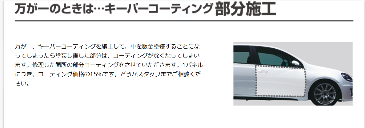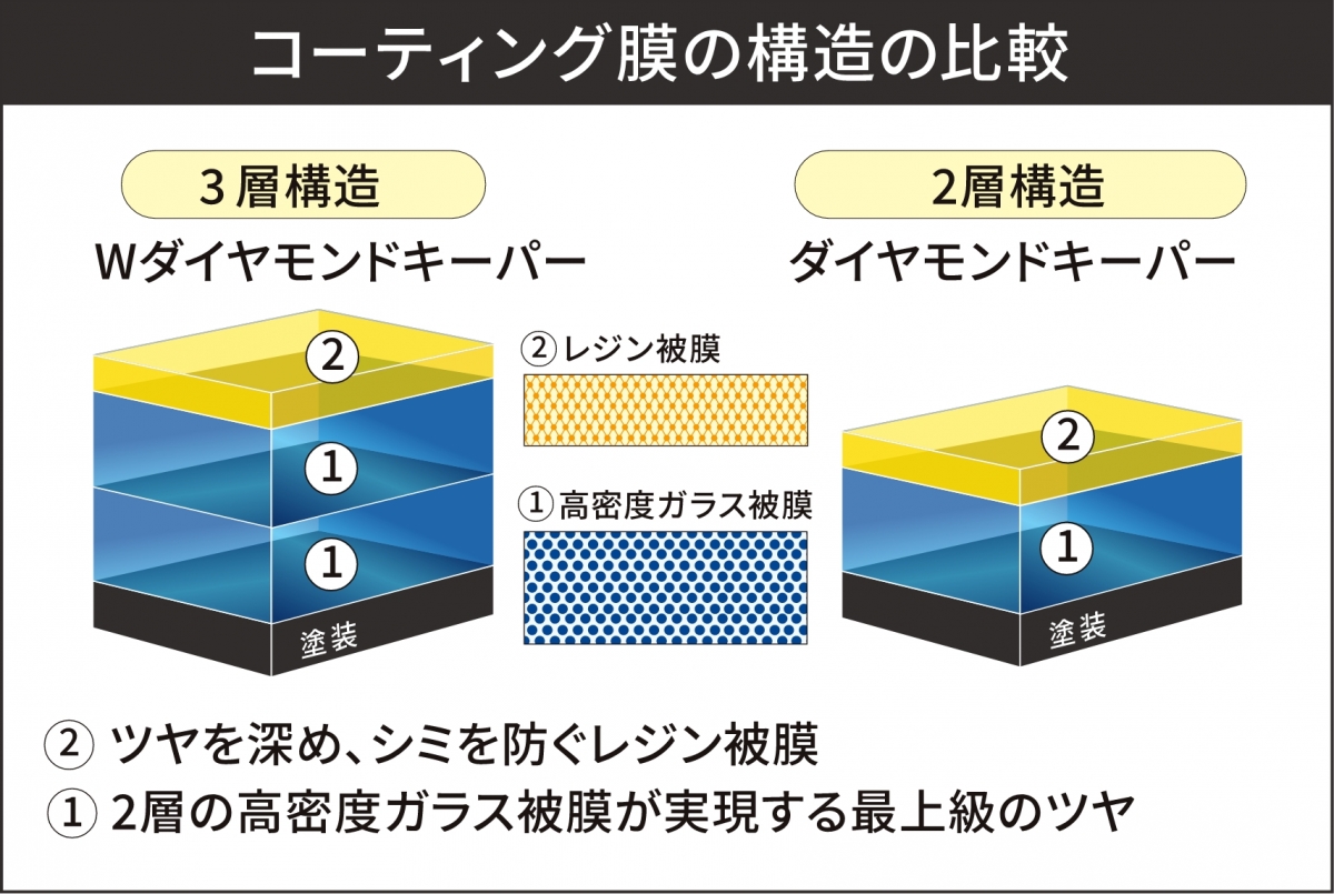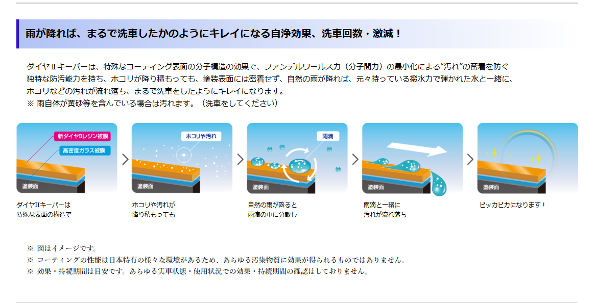エコダイヤモンドキーパーは ・ノーメンテナンスで3年間 ・2年(または1年)に1度のメンテナンスで5年間持続 1層目の「高密度ガラス」で深いツヤと耐候力を生み、2層目には”汚れ”の密着を防ぐ独特な防汚能力を持つ「エコプラスレジン」で、ツヤ・輝きも最高!ダイヤモンドキーパーシリーズで「一番汚れにくくなる」コーティングです。 雨が降ったら、まるで洗車をしたように”キレイ”になるので、お手入れがすごく”ラク”になります。