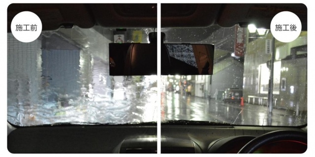 フッ素ガラスコーティングは窓ガラスのギラつきの原因である油膜を取り除き、フッ素系の撥水コーティングを行います。