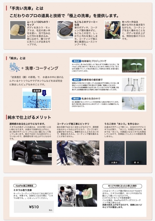 ずっとお客様に愛され続けてきた極上手洗い洗車が、「純水」を使うことで仕上がり時の美しさをワンランクアップしました。