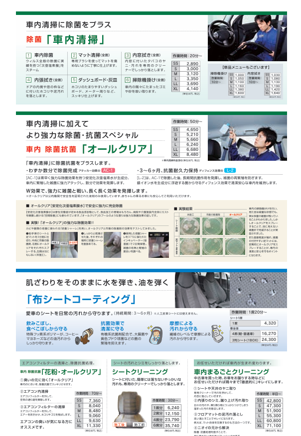 自信の車内清掃、 細かい所もキッチリキレイに。 ドライバーに一番身近な空間を爽やかに。 掃除機がけや内窓拭きはもちろん、内張りやダッシュボード周り・足元のマットまできっちりキレイに仕上げます。 キーパープロショップせき店の車内清掃は、 車内の部位をきちんと分け、専用の道具を使って確実に隅々までキレイにします。 お客様目線だからこそできる細部への心遣い。 車内清掃のスタンダード、内窓拭き、掃除機がけで 細かい所までキッチリキレイに 「車内清掃」 さらに車内清掃に「除菌・抗菌処理」をプラスした 「車内清掃プレミアム」 シートに付いた取れない汚れを落とす 「シートクリーニング」 車内を徹底的にクリーニングする「車内まるごとクリーニング」車内清掃もオレンジロード津江店にお任せ下さい。