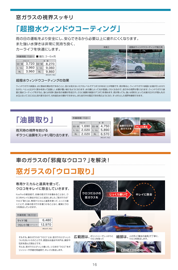 ボディだけではなく、クルマ全体を美しく演出する様々なコーティングをご用意いたしました。 車のあらゆる部分をコーティングします。 ホイールコーティングから窓ガラス撥水加工まで、パーツの劣化を汚れを防ぐものから、運転を快適にするものまで、さらなるキレイをお求めの方に、お好みのサイドメニューをご提供いたします。