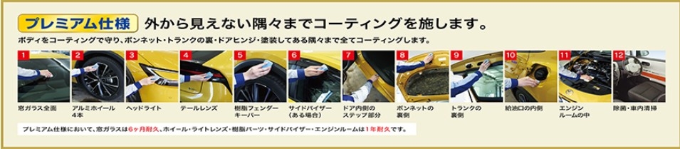 細部まで(窓ガラス、ホイール、レンズ類、バイザー、ステップ部分、ボンネット・トランク裏側、給油口内側、エンジンルームの中、樹脂フェンダーキーパー)あらゆる部分までキレイにしていくプランはプレミアム施工はEXキーパープレミアム