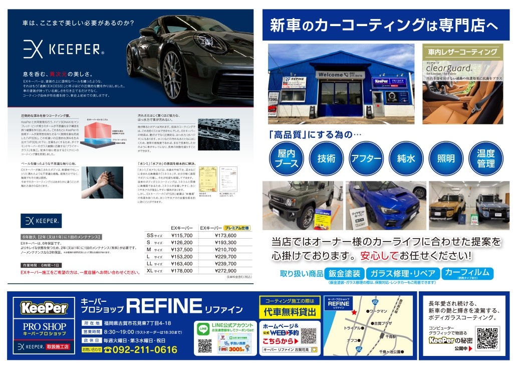 ◎新車、中古車からのご依頼を多く頂いており、【宗像・福津・古賀・新宮】では唯一のキーパーコーティング専門店。ヒヤリング・下地処理・仕上げ・アフターと、他社にはない最新設備と技術でおもてなし、また、オーナー様のご要望に沿ってメニューをご用意致します。