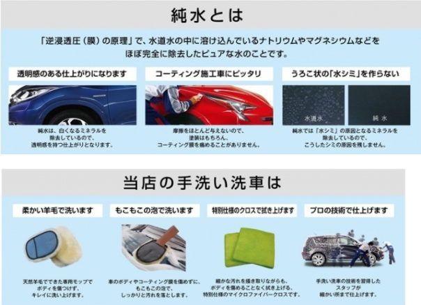 当店の手洗い洗車は、「純水手洗い洗車」です。 この洗車の泡は、洗浄力のためのシャンプーではなく、クッションとすべり剤の役割を果たす「ムース(泡)」で、 砂ボコリなどの摩擦から、やさしくお車を守りながら、洗います。ちょうど、シェービングクリームのようなものです。 また、純水で洗い流す為、ウォータースポットができないです。 「純水手洗い洗車」「ムース手洗い洗車」なら、安心してお任せいただけます。