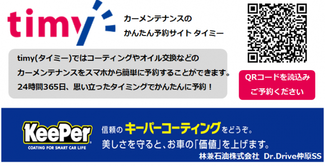 Dr.Drive 仲原SS / 林兼エスト(株)のメニューページです。timy(タイミー)なら洗車、タイヤ交換、オイル交換、コーティング、車検をはじめとしたカーメンテナンスに関わるサービスを、いつでもどこでも、オンラインで予約できます。