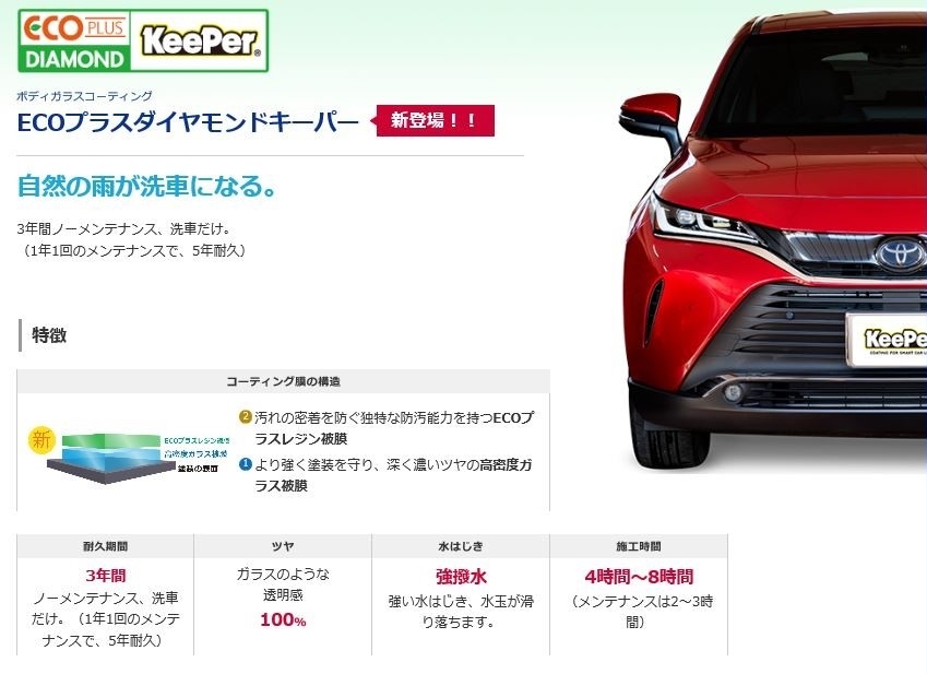 ECOプラス ダイヤモンドキーパーは、特殊なコーティング表面の分子構造の効果で、ファンデルワールス力(分子間力)による"汚れ"の密着を防ぐ独特な防汚能力を持ち、ホコリが降り積もっても、塗装表面には密着せず、自然の雨が降れば、元々持っている撥水力で弾かれた水と一緒に、ホコリなどの汚れが落ち、 まるで洗車をしたようにキレイになります。※雨自体が黄砂等を含んでいる場合は汚れます。(洗車をしてください)