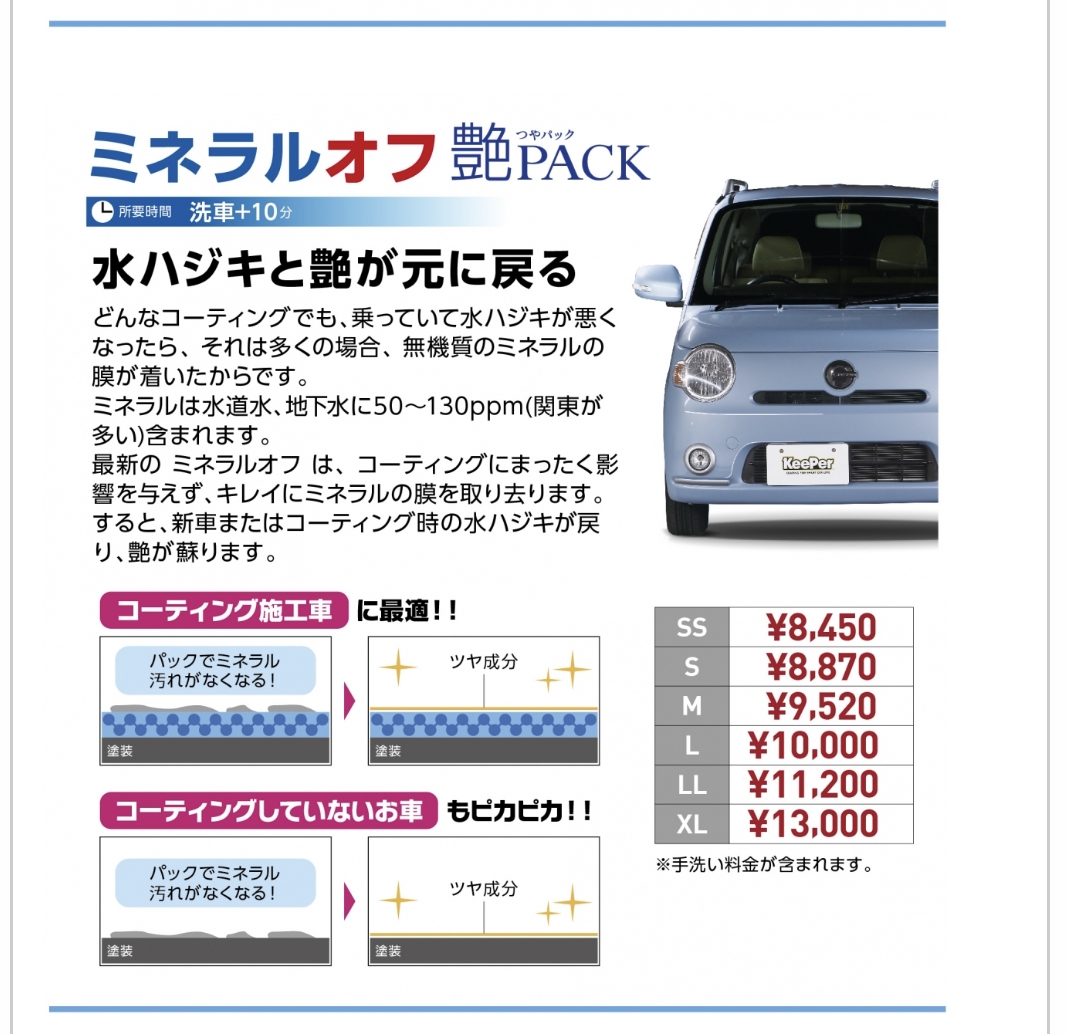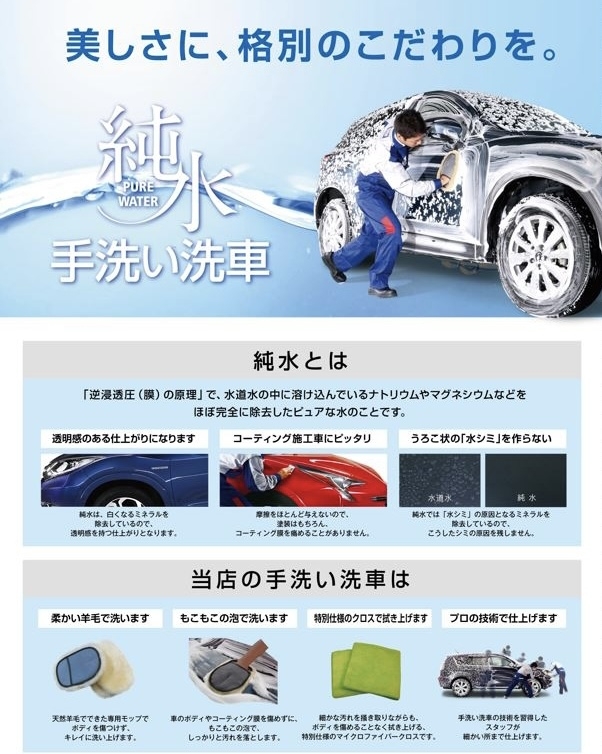水道水や地下水に含まれるミネラルは、「日陰のない場所」や「気温が高い夏季」など、作業途中で水が乾いたときにシミ(ウォータースポット)となって、洗車・コーティングの品質を妨げる可能性があります。“純水をひと掛け”することによって、純水独自の透明な仕上がりを実現し、作業のやり直しをすることなく、高品質に仕上げることができます。