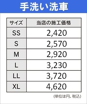 | 車内清掃 | 片方のみ | SS | ¥2,250 | ¥1,000 | S | ¥2,370 | ¥1,050 | M | ¥2,510 | ¥1,100 | L | ¥2,730 | ¥1,160 | LL | ¥3,180 | ¥1,380 | XL | ¥3,700 | ¥1,600 |
