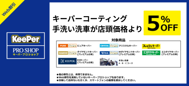 来店時にこのページを印刷して持参して頂くか、スマートフォン、携帯電話の画面を提示して頂いたお客様にはキーパーコーティング、手洗い洗車を5%OFFにて施工させて頂きます!