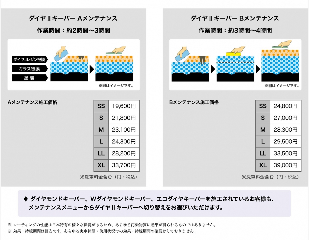 ④メンテナンス・再施工したほうがいい…基本1,3年ノーメンテナンスとなりますがメンテナンスをすることで3年の持続が5年の持続となり長期にお車のキレイを維持します。お客様ご自身でメンテナンスをお選びいただけます。またフレッシュキーパー・クリスタルキーパーは1年目以降リフレッシュ施工となり施工金額から3,000円引きで施工できます。