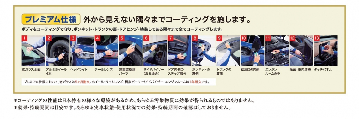 ※効果・持続期間は目安です。あらゆる実車状態・使用状況での効果・持続期間の確認はしておりません。