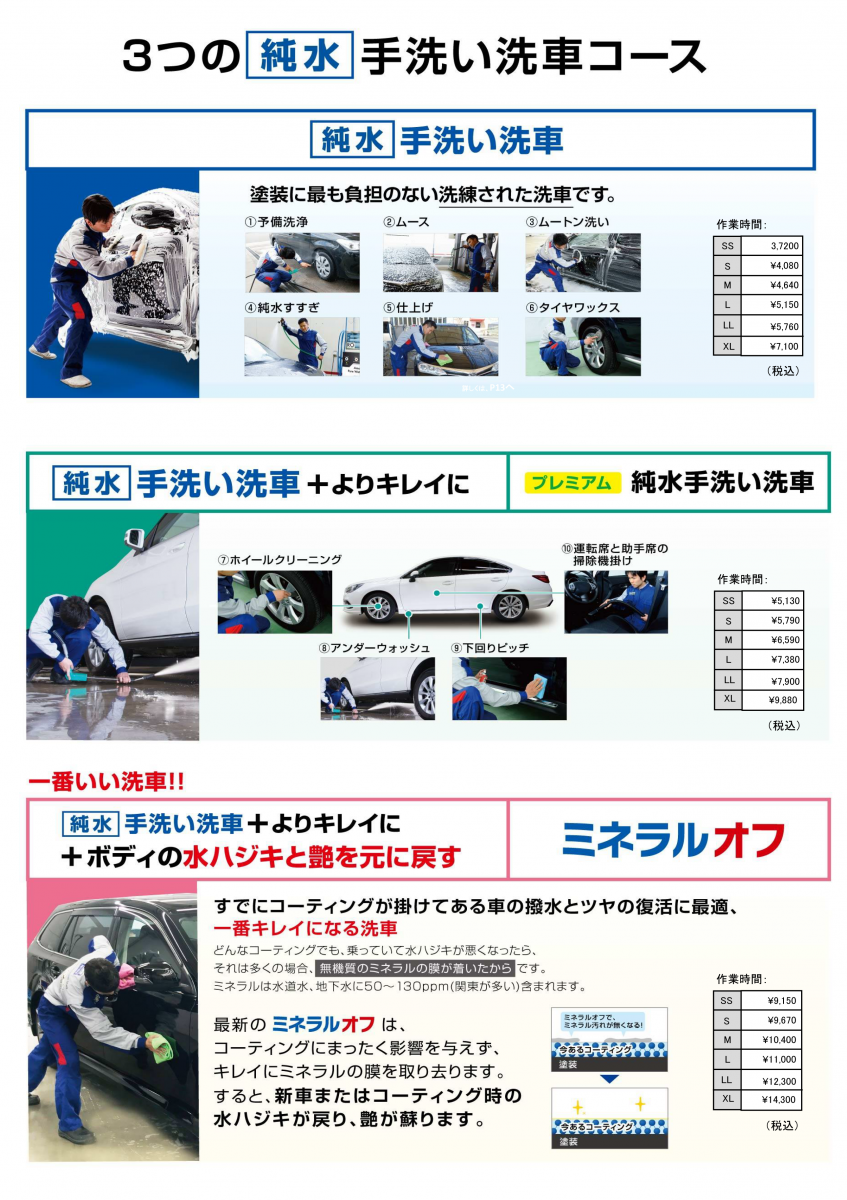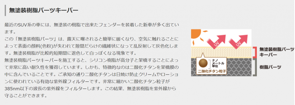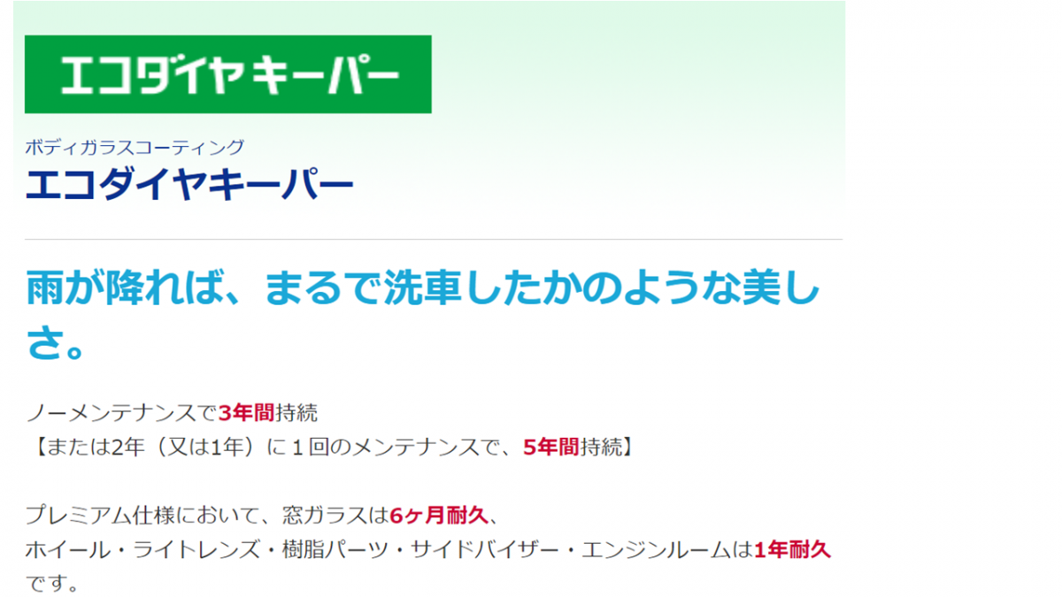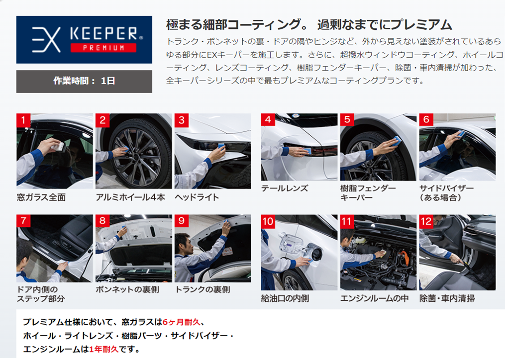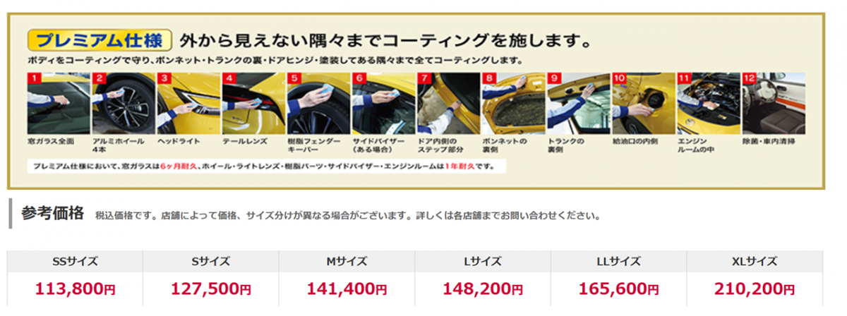 プレミアム仕様において、窓ガラスは6ヶ月耐久、 ホイール・ライトレンズ・樹脂パーツ・サイドバイザー・エンジンルームは1年耐久です。
