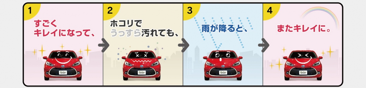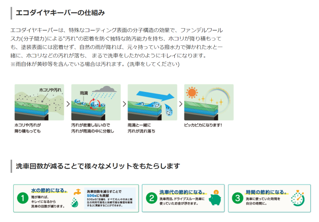 エコダイヤキーパーもフレッシュキーパーも、特殊なコーティング表面の分子構造の効果で、ファンデルワールス力(分子間力)による"汚れ"の密着を防ぐ独特な防汚能力を持ち、ホコリが降り積もっても、塗装表面には密着せず、自然の雨が降れば、元々持っている撥水力で弾かれた水と一緒に、ホコリなどの汚れが落ち、 まるで洗車をしたようにキレイになります。※雨自体が黄砂等を含んでいる場合は汚れます。(洗車をしてください)