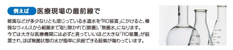 A:水道水の中に溶け込んでいるナトリウムやマグネシウムなどをほぼ完全に除去したピュアな水のことです。