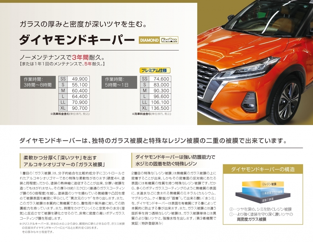 ダブルダイヤモンドキーパーは独自の厳しい技術認定試験に合格した1級技術認定者及び、鏡面研磨技術者が正確に丁寧な作業を行います。まず、鏡面研磨で小キズ、くすみを取りながら、その名の通り鏡のように磨き上げ、ダイヤモンドキーパーを2層に施工します。また、ガラス被膜を守るためのレジン被膜も施工致しますので計3層式でしっかりボディをガードします!