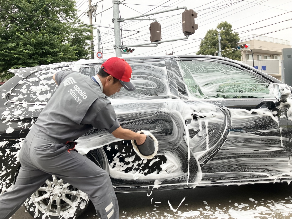 当店の手洗い洗車は、もこもこの泡の上から、優しいムートンで洗い上げます。