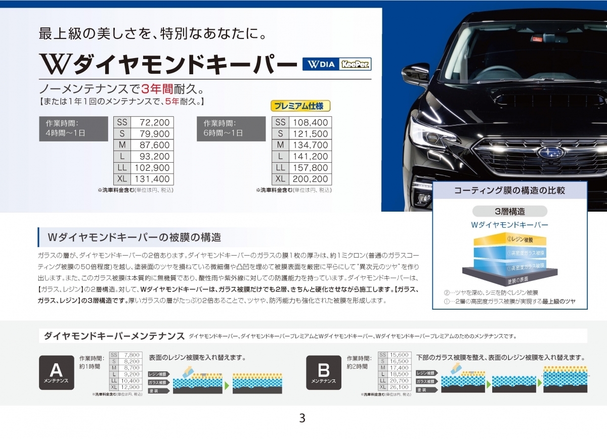 メンテナンスは1年に1度定期的に行うスタイルか、3年間ノーメンテナンスのスタイルと2種類のご用意となりますので、普段の駐車場所や、お手入れ状況を伺ったご提案をさせて頂きます。
