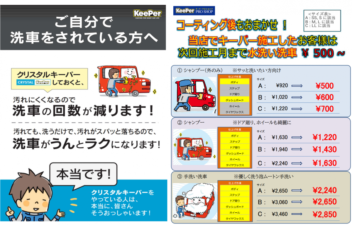 当店で施工頂いたお客様には、施工後のお手入れが手軽にできることを実感して頂きたいので、当店では格安の水洗い洗車をご用意させて頂くことに致しました!
